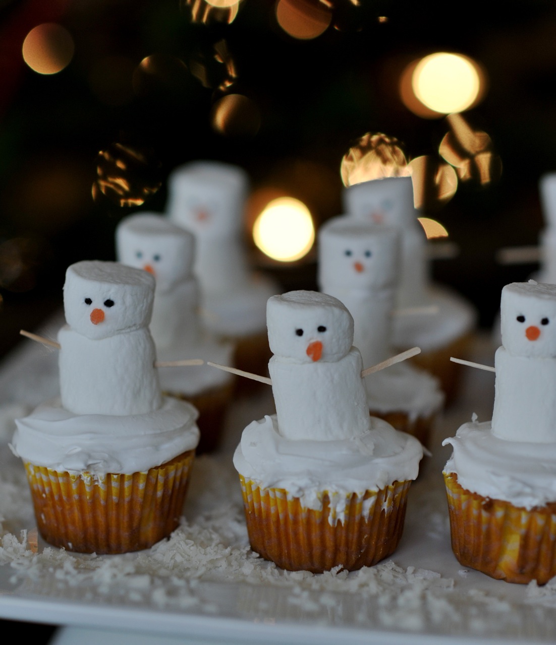 I made Snowman cupcakes using marshmallows, orange gummy slices, chocolate jimmies, and toothpicks (pretzel sticks would work great too)…