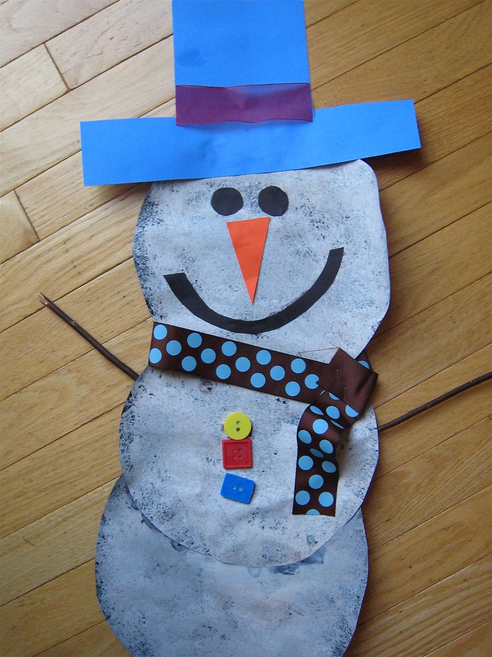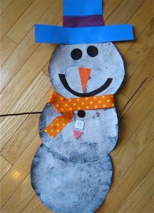 I cut out several different shaped circles for my kids in hopes to teach them about “small, medium, large”. I wanted them to choose one of each size circle and then glue them together to make the “perfect” snowman… Of course they both choose “large” for all three circles and I just couldn’t argue with them… Needless to say their snowmen are a little off balance, but the more I thought about it the more realistic this seemed to me… I also let them choose the shape and color of the hats, nose, eyes etc… and they both chose the same (of course) but yours might choose differently. After they have glued their three circles together, let them sponge paint the snowman with white paint. I like using a darker colored paper with the white paint for two reasons. One they can really see where they are painting and two it really shows them the texture! Once your snowman is dry, you can add all the snowman frills you’d like… Older children can do most of this themselves! Enjoy and happy MLK…