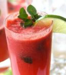 In a small pitcher, combine fresh mint leaves, sugar, and fresh lime juice. Using the handle of a wooden spoon, muddle the ingredients together, but not until the leaves fall apart. Pour rum and the watermelon puree into the pitcher and stir gently. YUMMY… I am going to have to make these “rum free” so I too can enjoy a fun summer beverage!