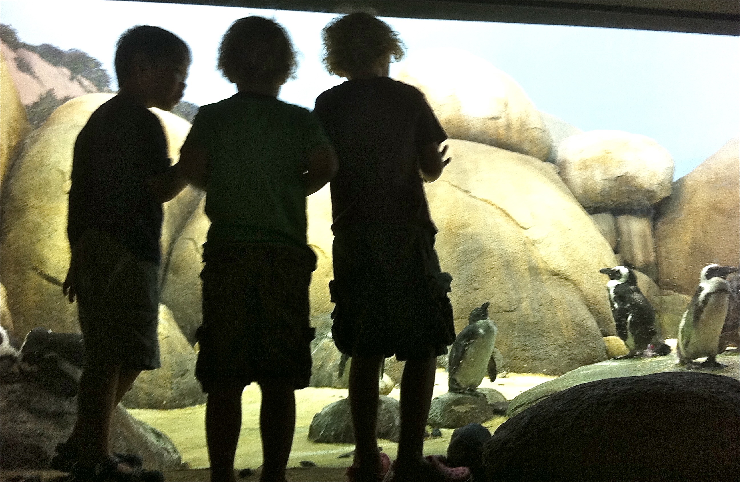 My boys were beyond excited… Asking things like “do we need to wear or winter coats, did they fly on a cold airplane, will they be sliding on their bellies?” They went as far as to learn some facts about penguins and share them with everyone they know… So we finally made it to the zoo, twice in the past week, in fact! AND we saw the penguins… A couple of surprises. #1, the exhibit is about an eighth of the size that I assumed it would be with all that construction. #2, it’s tiny in there, #3 and the best of all… THEY ARE AFRICAN PENGUINS, SO THERE IS NO SNOW… HAHAHAHAHAHAAHA They are in the sand and water… swimming and playing and looking all cute, but there is no snow. There is no need for our winter clothes. They probably came over on a heated jet. They do not slide on their bellies. They do not throw snowballs…. BUT, My boys loved them! They don’t care that there is no snow, they don’t care that the exhibit is small. They Loved them… They loved that they could climb on rocks to see them, they loved that they swim up and down, they loved that the penguins followed their feet as they kicked them up and down… Moral of the story… Sometimes our expectations let us down as adults, but as kids, they just learn to see the good in everything. A good lesson to learn…. so go out and see the penguins!