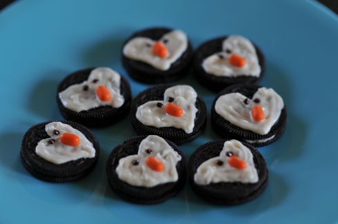 To make the cookies first melt the white chocolate and draw a white heart on each of the cookies. I melted my chocolate in a squeeze bottle and then just drew them… You could probably use white frosting as well and just spread it on… what ever is easiest for you! While the chocolate is still wet you will want to add the tic tac for a beak. If you are using mini chocolate chips for eyes you will want to add those now too. I melted some chips and painted the eyes on with a tooth pick, either will work… That’s it… so easy…. I think that you could also melt some orange melting chocolate and draw little penguin feet or even the beak for that matter, but this worked for us! Super easy, adorable, cute after dinner treat!