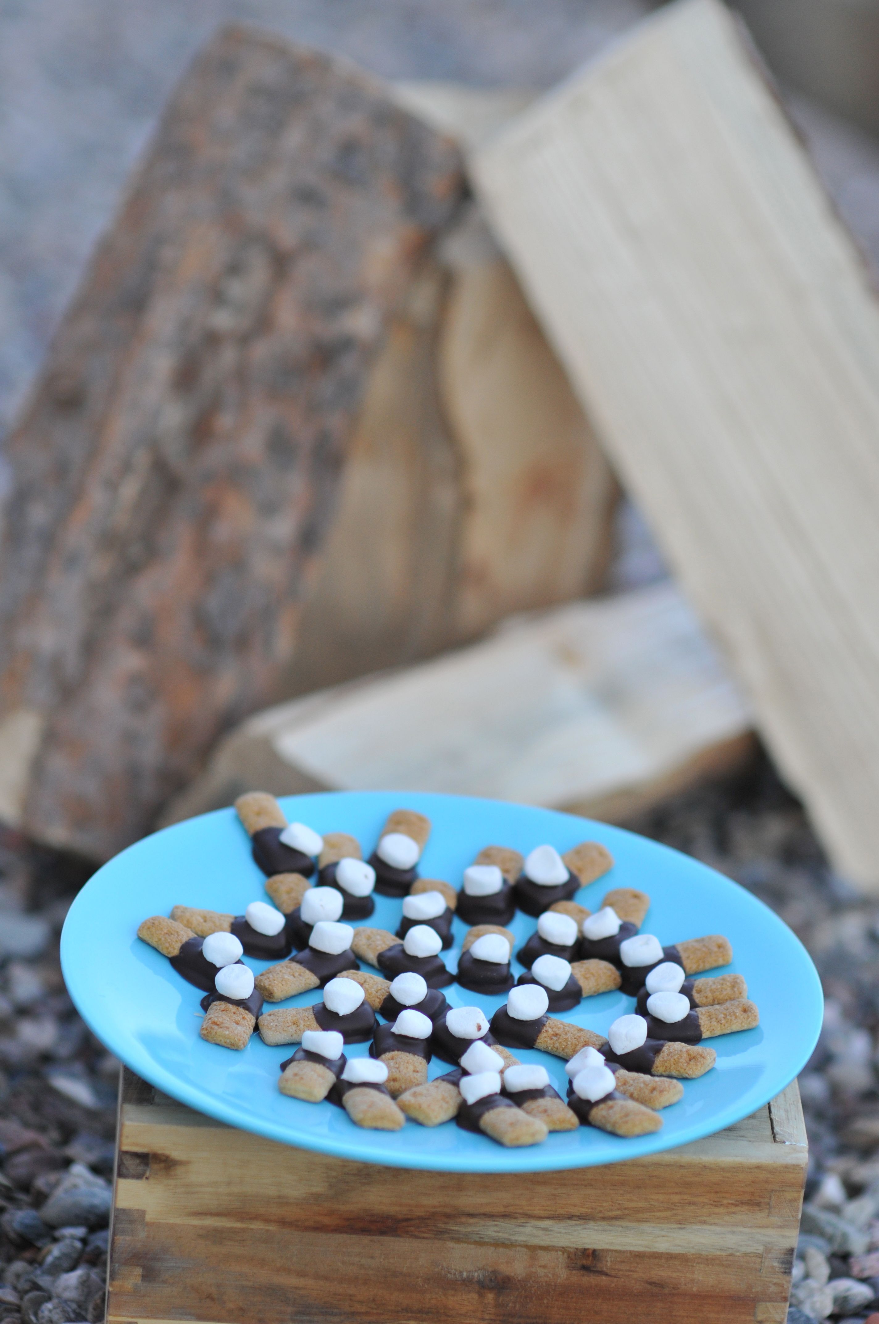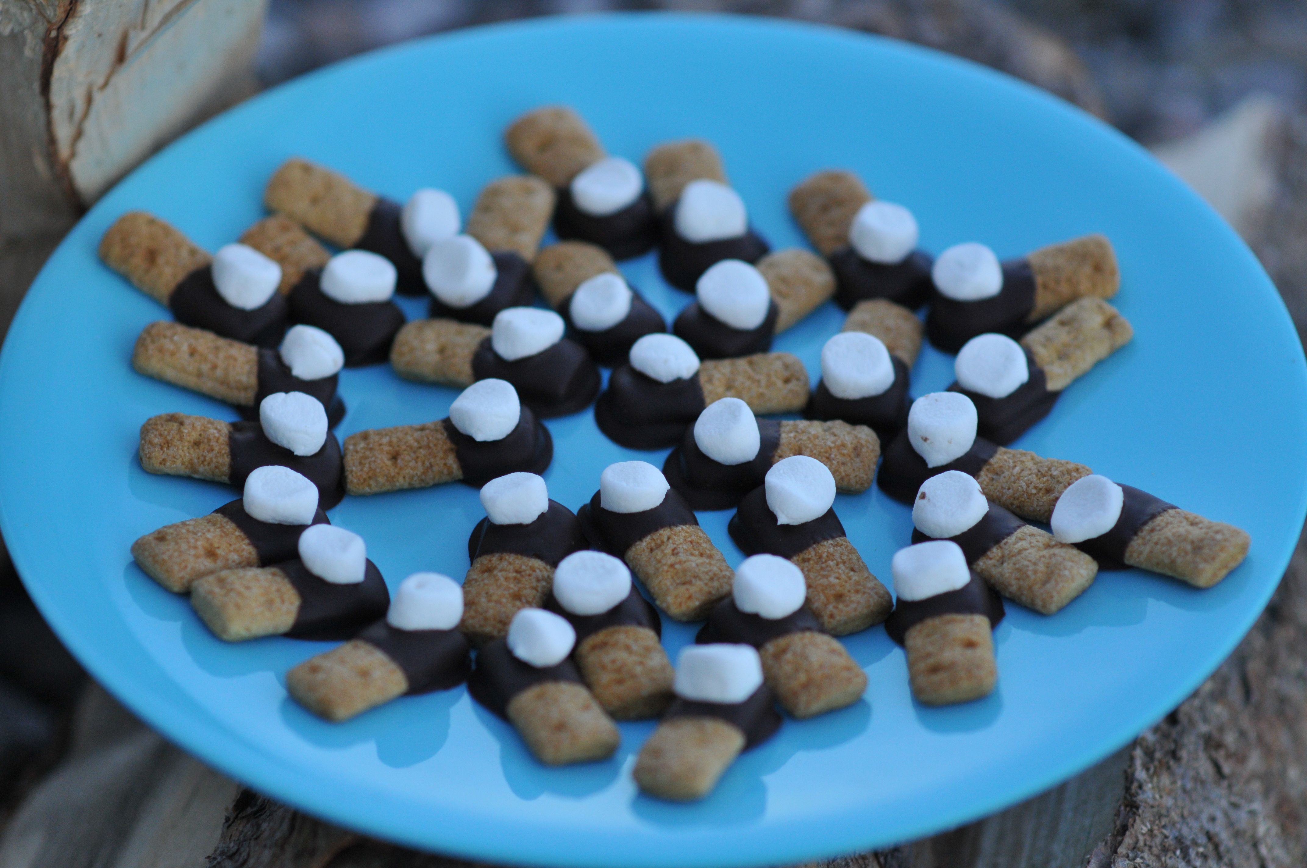 You see, I was making some chocolate dipped strawberries for our small group from church. Upon completion of said strawberries I realized I had an abundance of chocolate left, melted, with no where to go… I could not waste chocolate-that would be awful! I literally went to my pantry and searched for something I could dip in chocolate. We didn’t have tons of options, but we did have these “Honey Graham Sticks” and marshmallows so I thought – Mini S’Mores! I ended up cutting the marshmallows in half because I thought they were too big on the graham stick whole. I just dipped the graham and stuck on the marshmallow-so easy, but SO YUMMY! They were a hit!