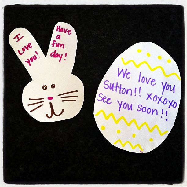 I try to leave little notes in the boys snack boxes, lunch boxes, or backpacks every day. I love imagining the looks on their faces when they open their snack/lunch and feel the love! This morning they actually asked me for a note, which proved to me that it makes a difference to them… They are only little once and I’m not sure they will want notes from me when they are 15 so I’m going for it now! I try to cut out little shapes that have to do with something going on in their lives. This week it’s Easter… Next week I’m planning to do little airplanes because we are taking a trip on Friday. I’ve done shapes during Sutton’s geometry unit, shamrocks for St. Patty’s Day, snowflakes on snowy days, and sunshines on sunny ones! I encourage you to drop your little ones a note when ever possible!