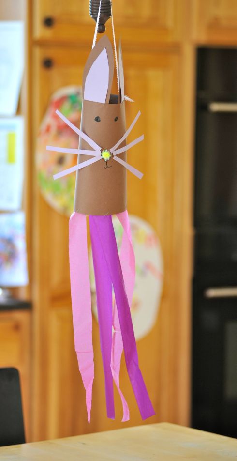 Roll a piece of construction paper into a tube shape. Glue or staple the seams. Cut out and glue on some ears, whiskers and a nose. The nose has a hard time sticking, so just press down for a minute or two to assure it sticks. Cotton Balls seem to stick great if you want to use one for the nose. We used them for the tail… Let these dry prior to drawing on the mouth and eyes. You can also use google eyes if you prefer. Cut out strips of tissue paper for the bottom and glue or staple them on. VIOLA a bunny windsock….