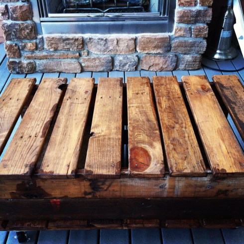 Brian and Ben are now on to what they say is a more simple project, the pallet couch…  I’m anxious to see their rendition and to post pics for you!  For now you can gawk at our pallet coffee table :).  If you want to know specifics I’d be happy to have Ben send you an email, just let me know in the comments section!