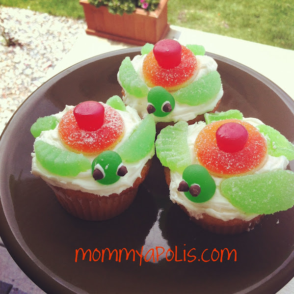 2. We used peach rings, dots, chocolate chips, green fruit slices and frosting, but you could also use sour apple rings (I didn’t see these until it was too late, but so cute because they are green), gummy worms, gum drops, green M&M’s etc… be creative.