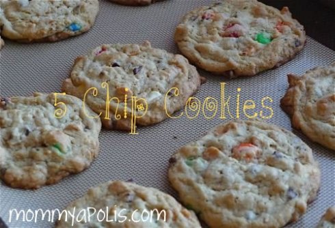 2/3 cup each of 5 of the following fruits, nuts, chips, etc… So basically choose 5 things you like in your cookies and and 2/3 cup of each of them… Here are some options: