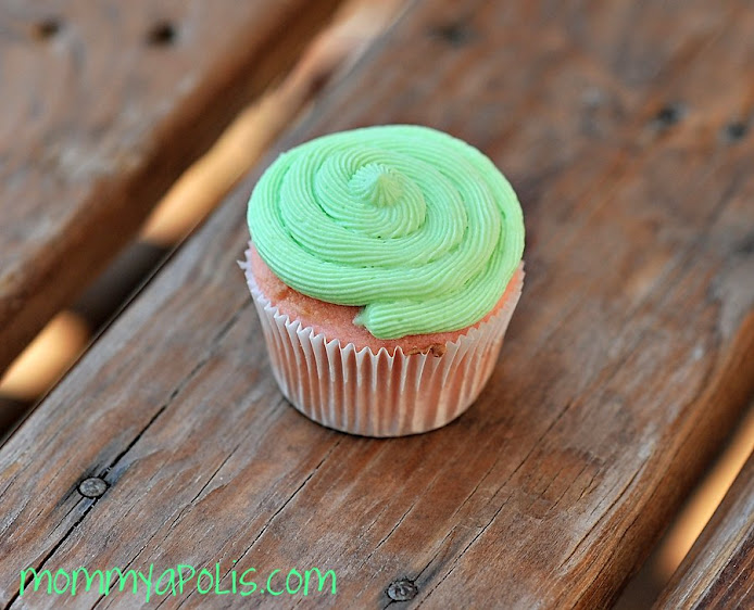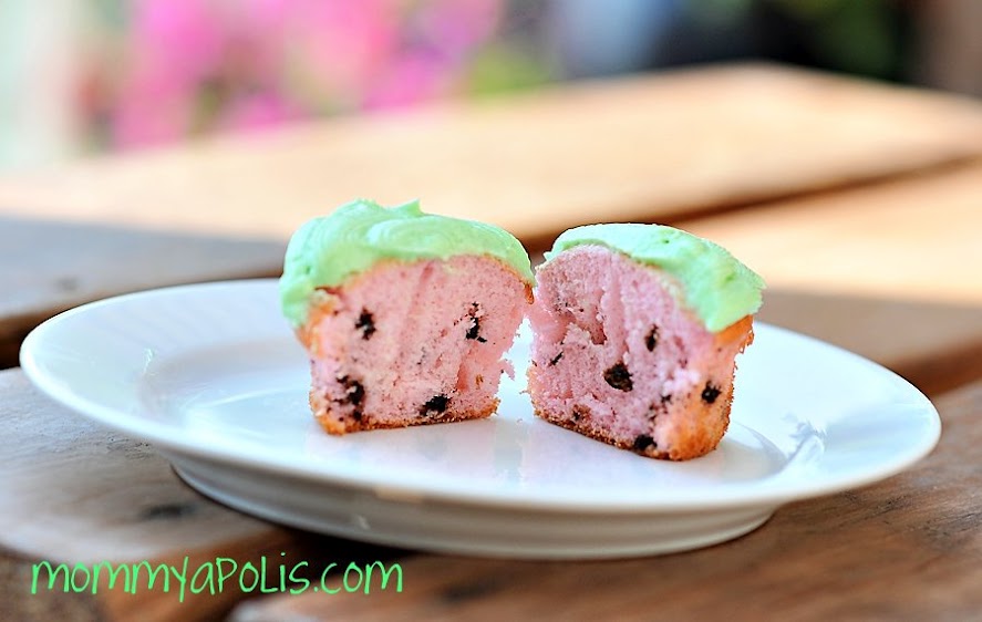 Basically you just make your favorite white cake (mix or homemade) add pink food coloring (I used Wilton, but if you can’t do red dye you could make your own with beets – recipe here). We also added mini chocolate chips to the batter for the “seeds”. When cooled and ready to frost we did so with our favorite buttercream icing recipe (Wilton again) with a little green food coloring added to the mix… Yummy, easy and fun! Great for an end of summer BBQ!
