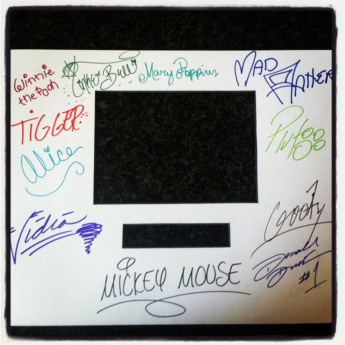 10. My take on autographs… My kids of course loved getting autographs. I decided that instead of getting an autograph book I would have the characters sign a photo frame matte. I think they turned out really adorable and we are letting the boys pick which photo they want to put in their special frame (they each have a matte). There is even room for the few we missed (Minnie and Peter) to sign next time :).