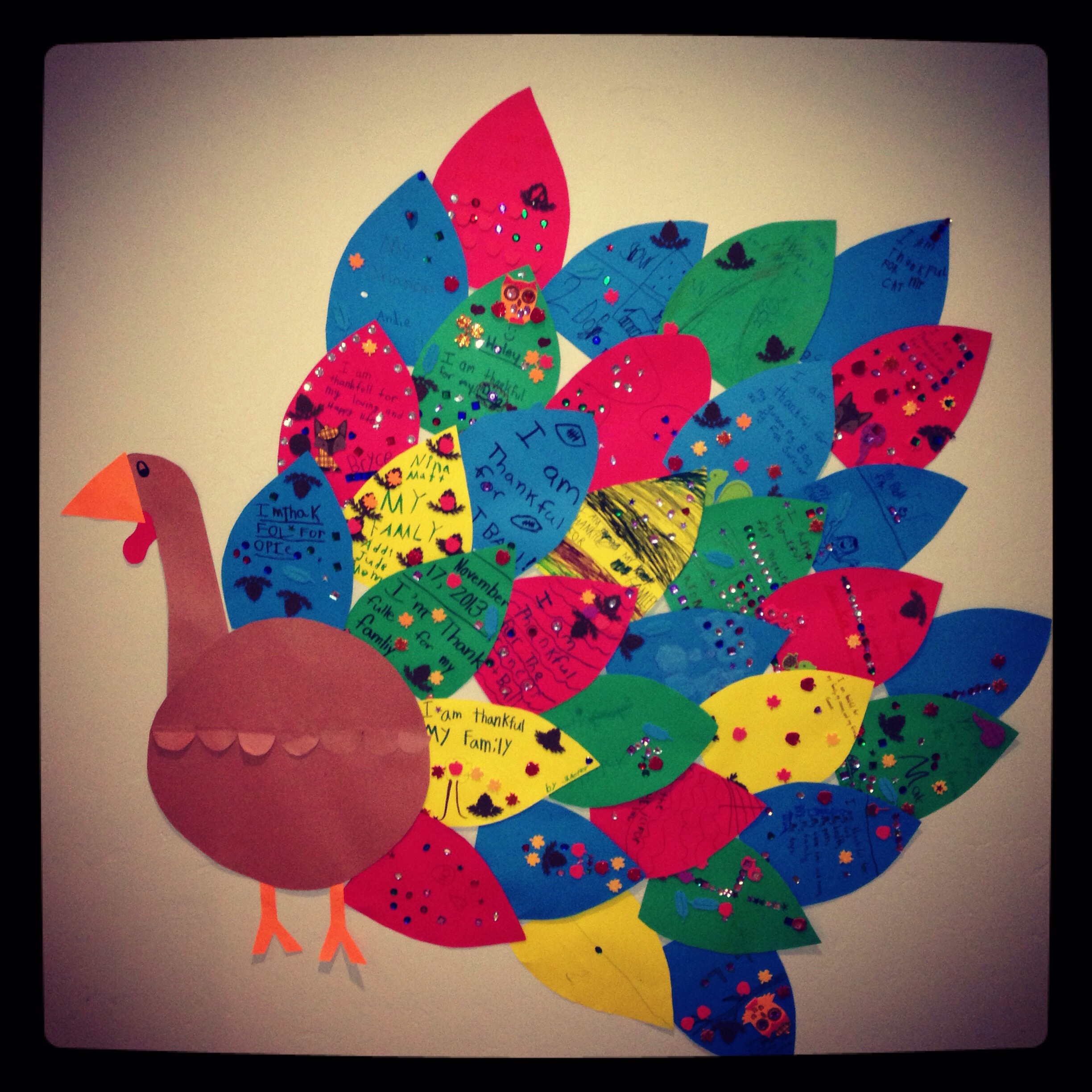 In an earlier post I mentioned that I used to do a gratitude activity in which the kids would write what they are thankful for on a turkey feather. We then combined our thankfulness feathers to make a gratitude turkey… I did this activity at church this morning and think our turkey turned out pretty cute! You could easily do this with your family or your dinner guests, as well! So easy, so cute, so meaningful!!! Gobble Gobble