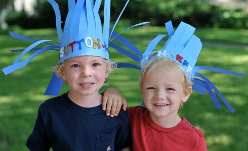 You will need red, white or blue construction paper, stickers, markers, tape or staples. For each hat I used a sheet of 12×18. I cut a 2 inch strip off length wise of each of the papers to use as an “extender” to fit around their heads. I then cut one inch strips of “grass” down each of the papers until I had about 2 inches to go (for the headband)… I then added the extender and let the kids do the rest… I had some glittery letter stickers that I let them stick on for their names and then I flipped the paper over and let them put the star stickers on the other side (only so that when the grassy strips fell down you could see the stars… For some reason wording this description is a lot harder than it actually was. You can probably tell exactly what I did by looking at the pictures! I did make the littlest peanut a “Frilly” hat by cutting zig zag strips instead of straight… Once the kids are wearing them you can fold the strips down so they dangle a little. It was windy today so ours were kind of blowing in the wind, which was pretty cute too! Have fun and happy 4th!