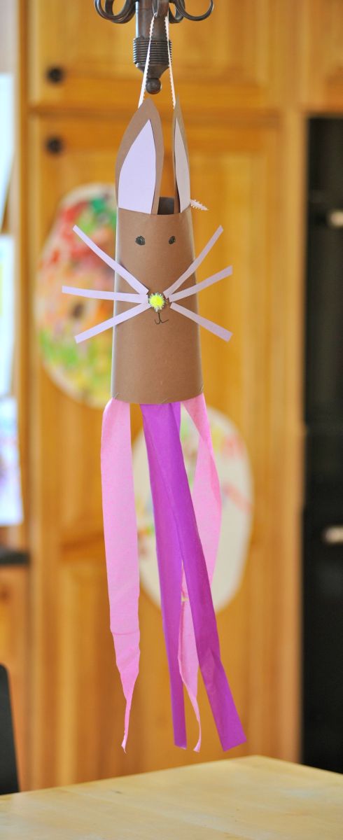 Roll a piece of construction paper into a tube shape. Glue or staple the seams. Cut out and glue on some ears, whiskers and a nose. The nose has a hard time sticking, so just press down for a minute or two to assure it sticks. Cotton Balls seem to stick great if you want to use one for the nose. We used them for the tail… Let these dry prior to drawing on the mouth and eyes. You can also use google eyes if you prefer. Cut out strips of tissue paper for the bottom and glue or staple them on. VIOLA a bunny windsock….