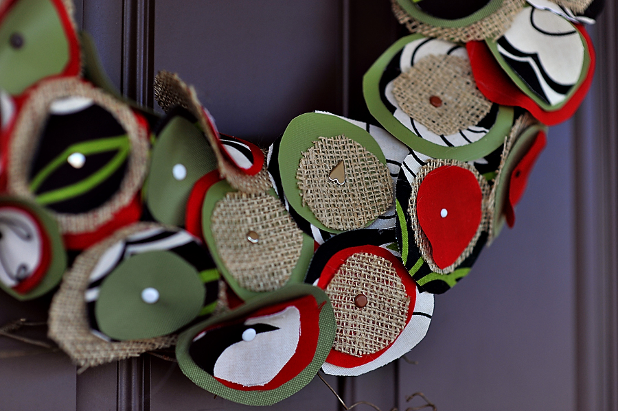 Last summer I saw a picture of a wreath online and for the life of me I can’t find it again, boo… Someone had linked it up as a fourth of July wreath and I thought it was adorable. I remembered the general concept and altered it a bit to make a Christmas wreath. I started by buying a grapevine wreath at the craft store… For me, that was Walmart :). I then gathered up some fabric in holiday colors, burlap, and scrapbooking brads (notice the hearts left from a Valentines Day shower I hosted). I used measuring cups (one cup, half cup and fourth cup) to trace different circles from different fabric scraps. I used the metal brads to combine one circle of each size in different fabrics… I left the brads open in the back so they would stick into the wreath. I put a dash of hot glue on the pointy end of the brad and stuck it into the grapevine wreath… I continued this all over the wreath until it was mostly covered. I did not cover the back and even some spots on the sides are showing… That was just me being lazy and feeling it wasn’t needed. Obviously if you chose to do this it would look even better :)! You could do all sorts of variations on color, size, even shape… The burlap “flower” at the top is just made by fan folding the fabric and gluing it together. I just made a ribbon tie at the back and slipped it over my door hanger. I am not sure I really like it there, so I might move it. I always seem to change things up after I take the pic! This wreath took me about 2 hours to make and I think it’s fun and different. You could make one for each holiday :). I hope you are starting to get in the holiday spirit around your house, I know we are!