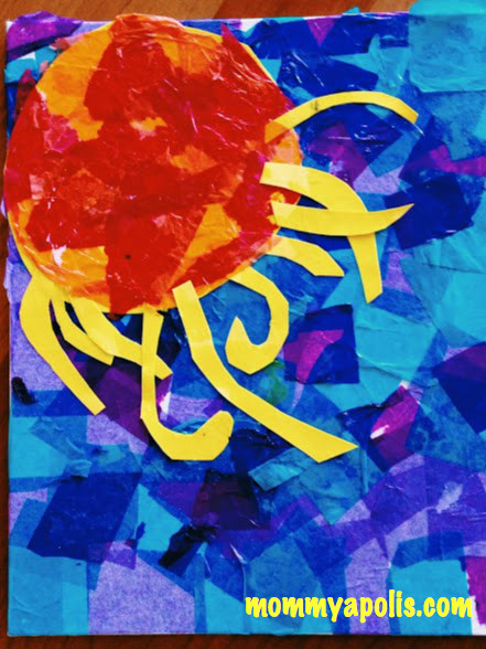 When we think about fall we are constantly reminded of the beautiful changing leaves and bushes. But there are so many other beautiful things that happen in fall, as well. One think I love in particular is the beautiful sunsets we get in the fall. In Minnesota it’s especially amazing to watch the gorgeous orange, yellow and pink hues of the sun reflect of the lake. In Colorado it’s pretty spectacular to see the Alpine Glow off the snowcapped mountains! Here is a project that was done by using modge podge to stick tissue paper on a canvas to resemble a sun setting. I first had the kids spread a thin layer or modge podge on a blank canvas. They then placed blue and purple tissue paper on top of the modge podge and then put another layer of modge podge on top of that. They then cut out their sun how ever they wanted and added more tissue and modge podge to the top of it! This is what they got: TADA!