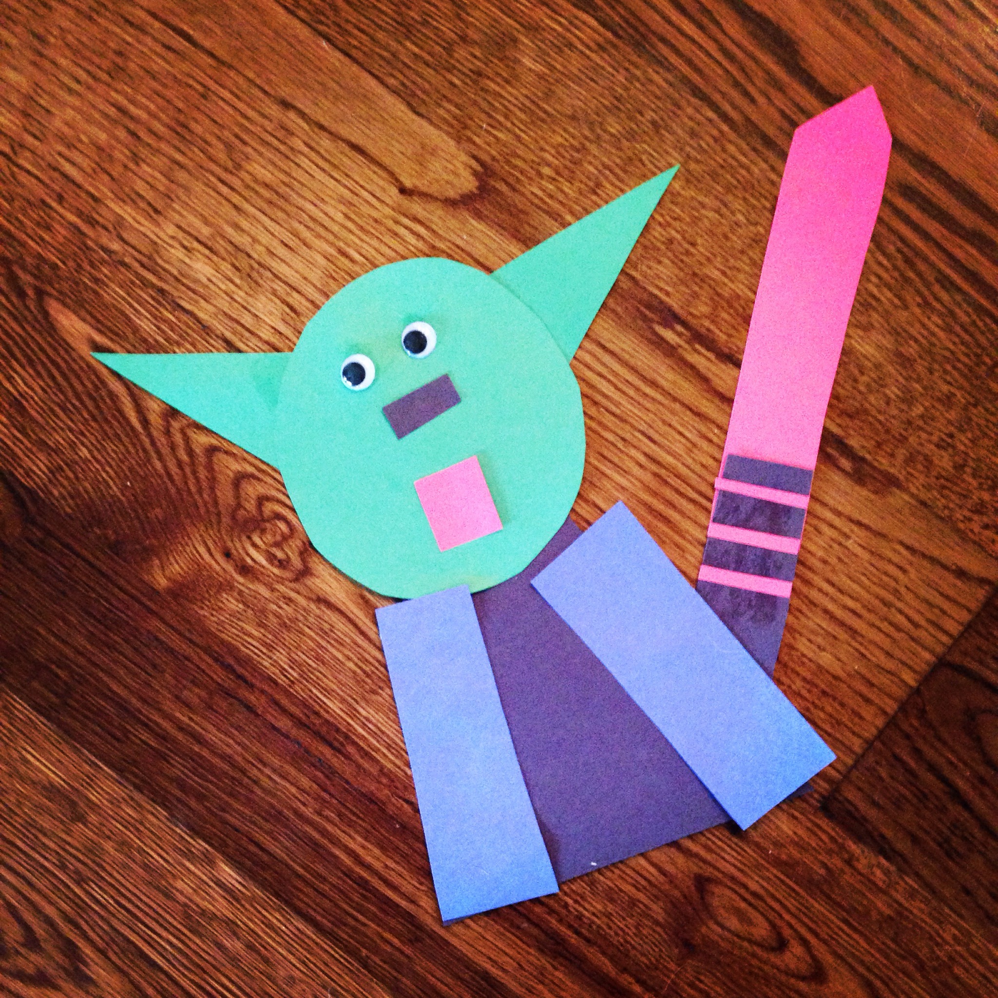 My newly 4 year old has made this craft twice already and will probably want to make it again today 😀! It’s very easy because it’s just shapes glued together! If you would like to download a template for free, please visit my tpt store by clicking here!  It’s also great practice in identifying shapes- cutting (if desired) and gluing! In the one pictured I had the shapes all cut out and a picture of Yoda printed out and let him glue them how he thought Yoda looked! He did a pretty great job!!! The second one he made with his 8 year old brother and he cut the shapes out himself! I don’t have a picture because I have no idea where he “hid” this Yoda 😉! If I find it I’ll post it! Enjoy!!!!