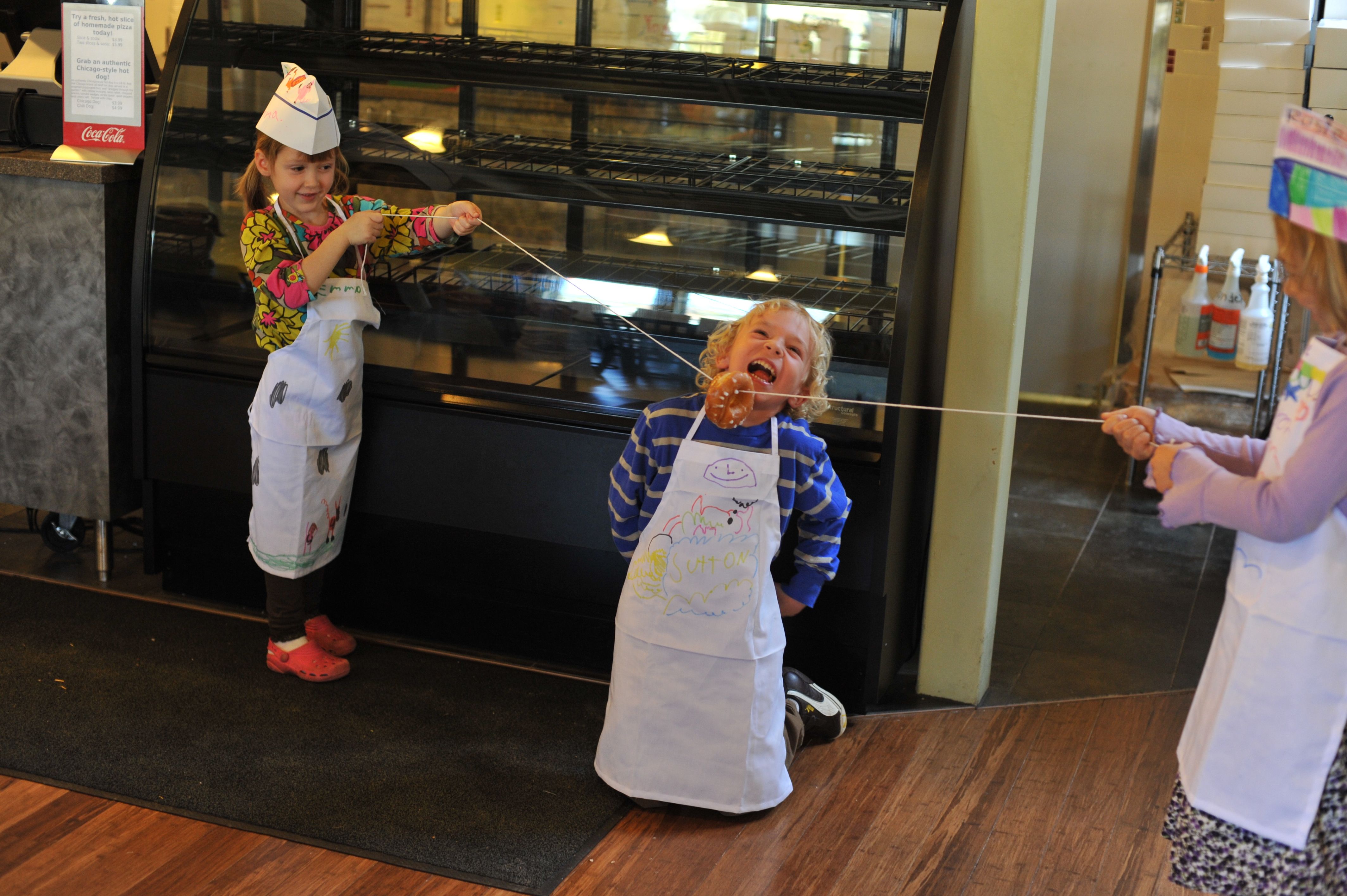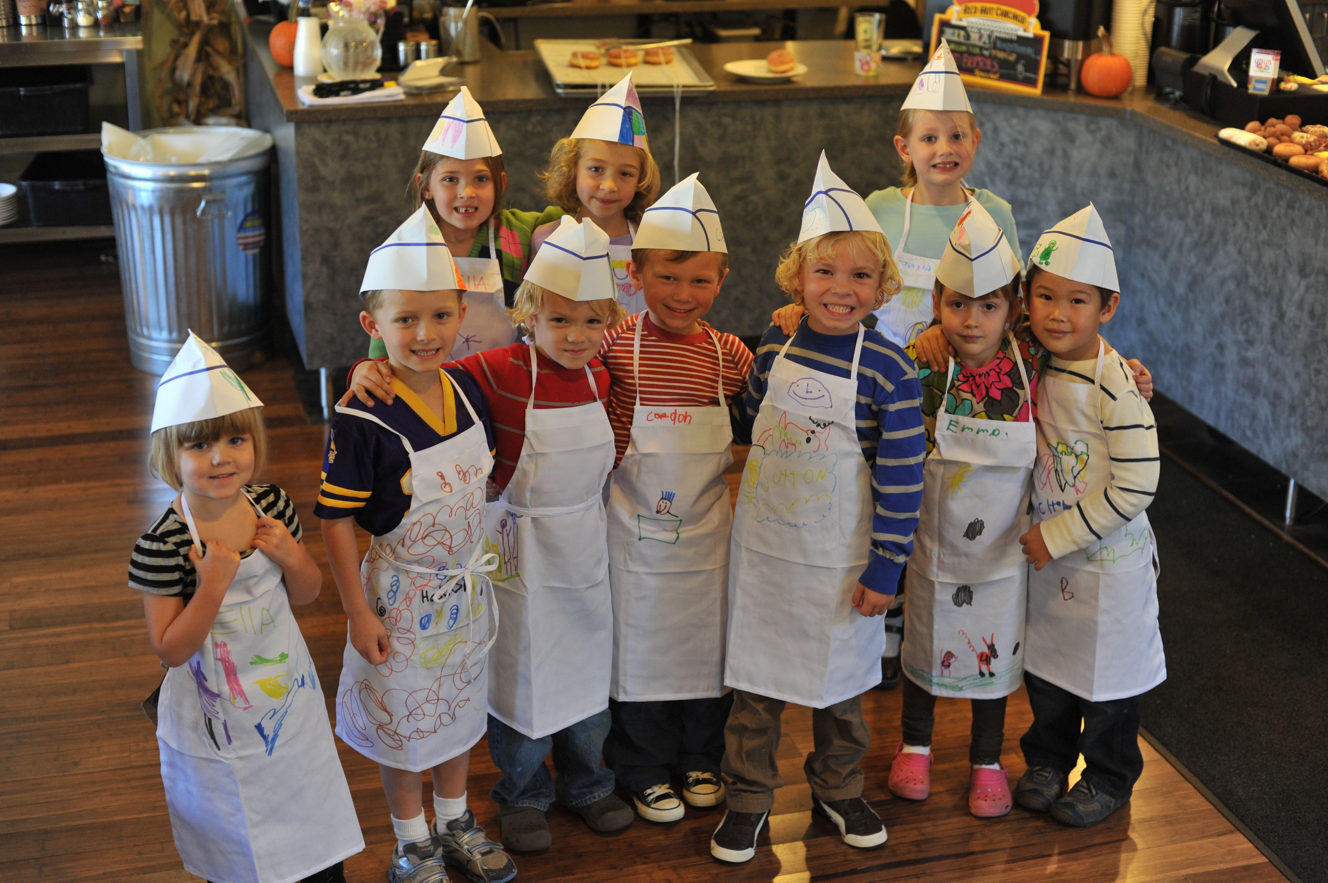 After we toured the bakery we had to get suited up for donut decorating… This meant we needed APRONS… The kids used fabric markers to make their aprons all their own!