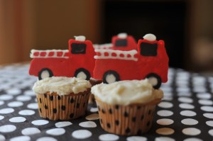 These are the cupcakes I made for all of the kids. I made the firetrucks out of candy melts… Here is the scoop…