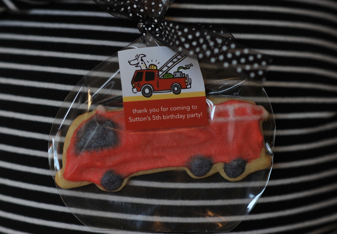 In leu of gift bags we sent the kids home with their hats, badges, artwork, a few coloring sheets, and these cookies.. I just made sugar cookies and used a firetruck cookie cutter… I then decorated them to look similar to a fire truck… This isn’t the best picture, but you get the idea…