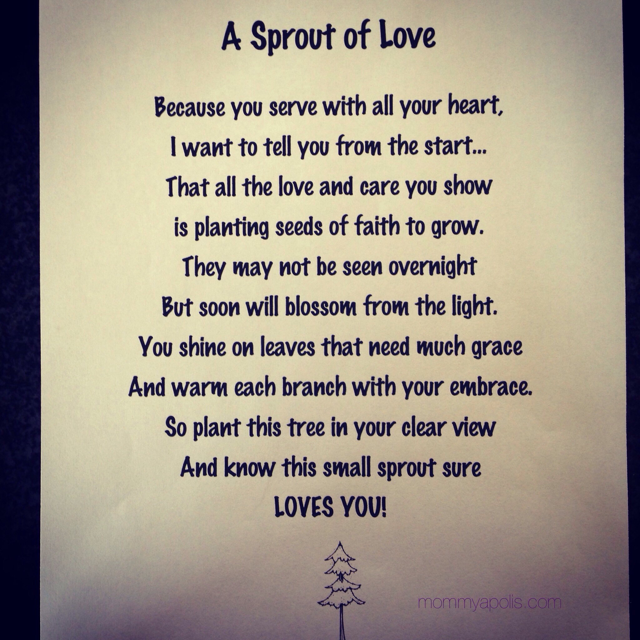 15 MayThis is such a fun project! I actually made it with my Sunday School Class and they had a lot of fun with it! We used small canvases, tempura paint, corks as paint brushes, and a little glue to put the poem on the back of the canvas! We also handed out a pine tree as a little gift! This really is a fun and thoughtful gift for a mom, dad, teacher or friend! Enjoy!!!