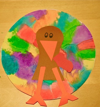 This craft can be done with any kind of paper or even a paper plate if you want. We just did scrapbook paper because it made them a little more colorful. I’ve made these turkey’s before using construction paper in all different colors for the feathers- also very cute! You could also just use white paper and let them color the body brown and decorate the feathers how ever they want! Do what you can!
