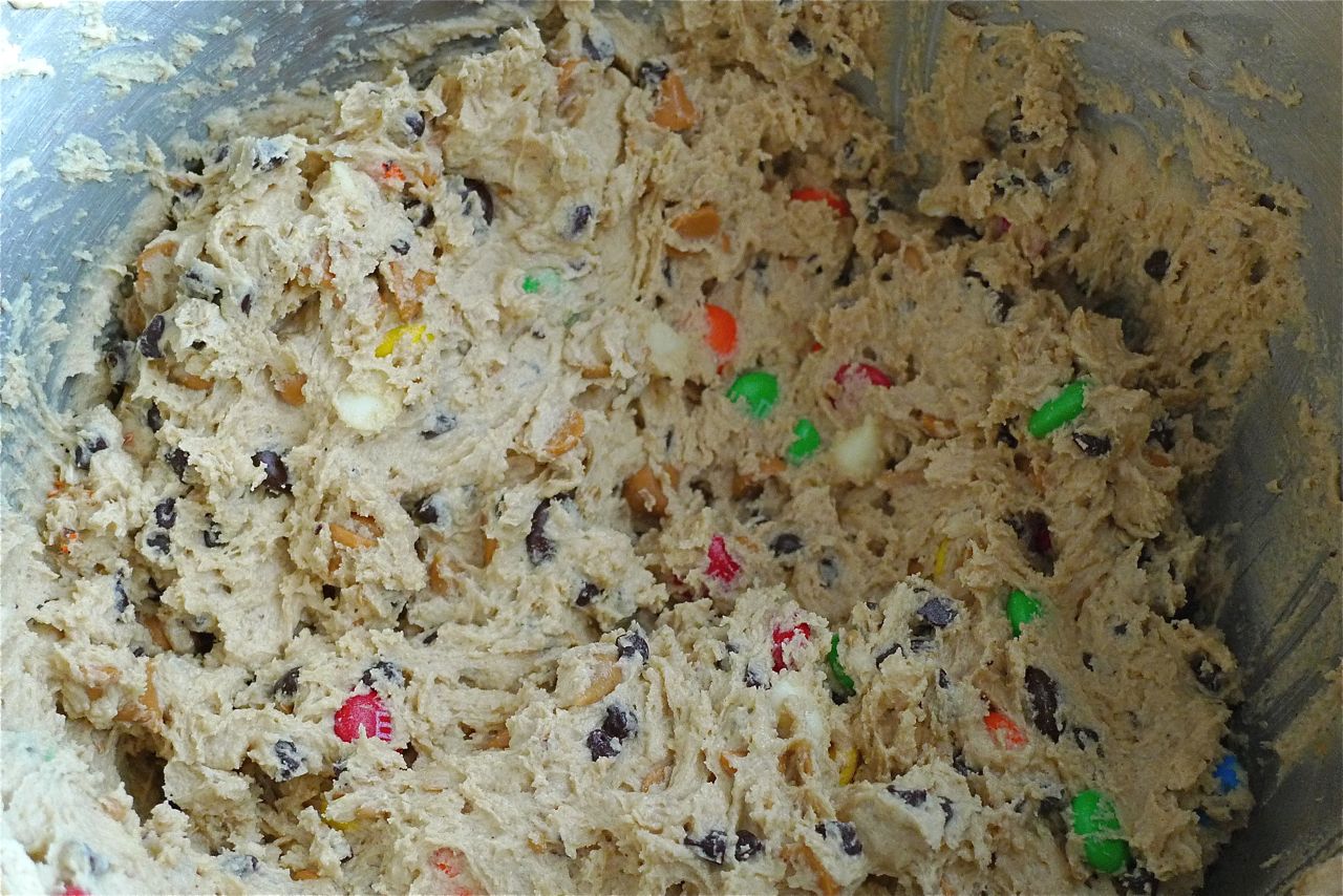 2/3 cup each of 5 of the following fruits, nuts, chips, etc… So basically choose 5 things you like in your cookies and and 2/3 cup of each of them… Here are some options: